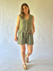 Vest sin mangas abotonado, en lino italiano - Composición: 100% lino- Talla: Talla única- Colores: Blanco, Beige, Fango, Rosa, Teja, Burdeo, Musgo, Celeste, Azul Marino y Negro.