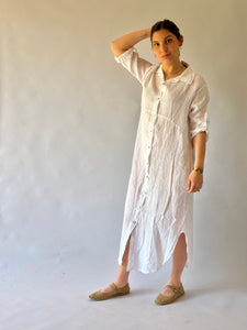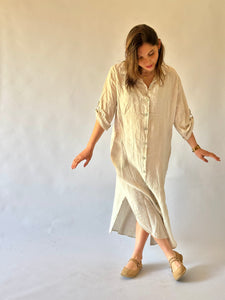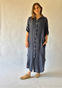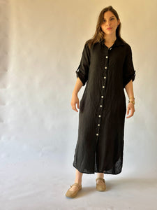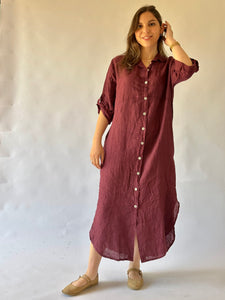 Vestido camisero largo con manga 3/4, en lino italiano - Composición: 100% lino- Talla: Talla única- Colores: Blanco, Beige, Fango, Marrón, Rosa, Teja, Burdeo, Musgo, Celeste, Azul Marino y Negro.