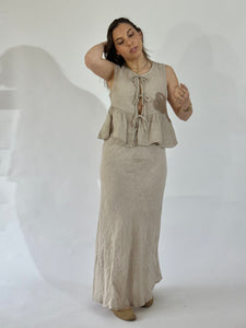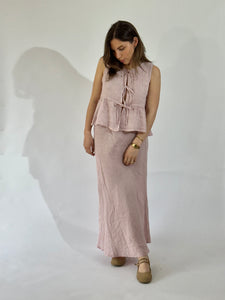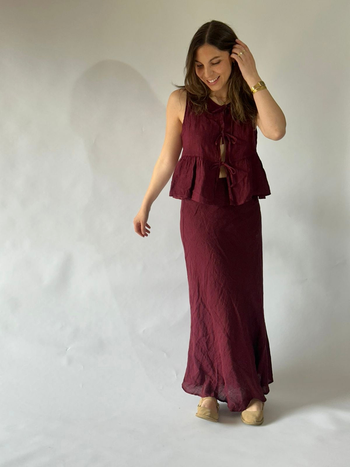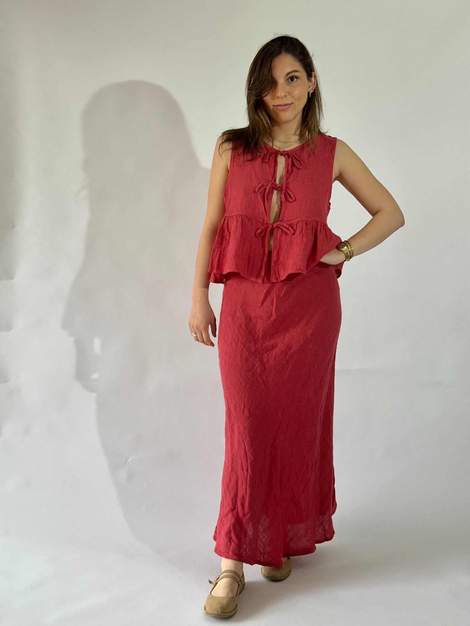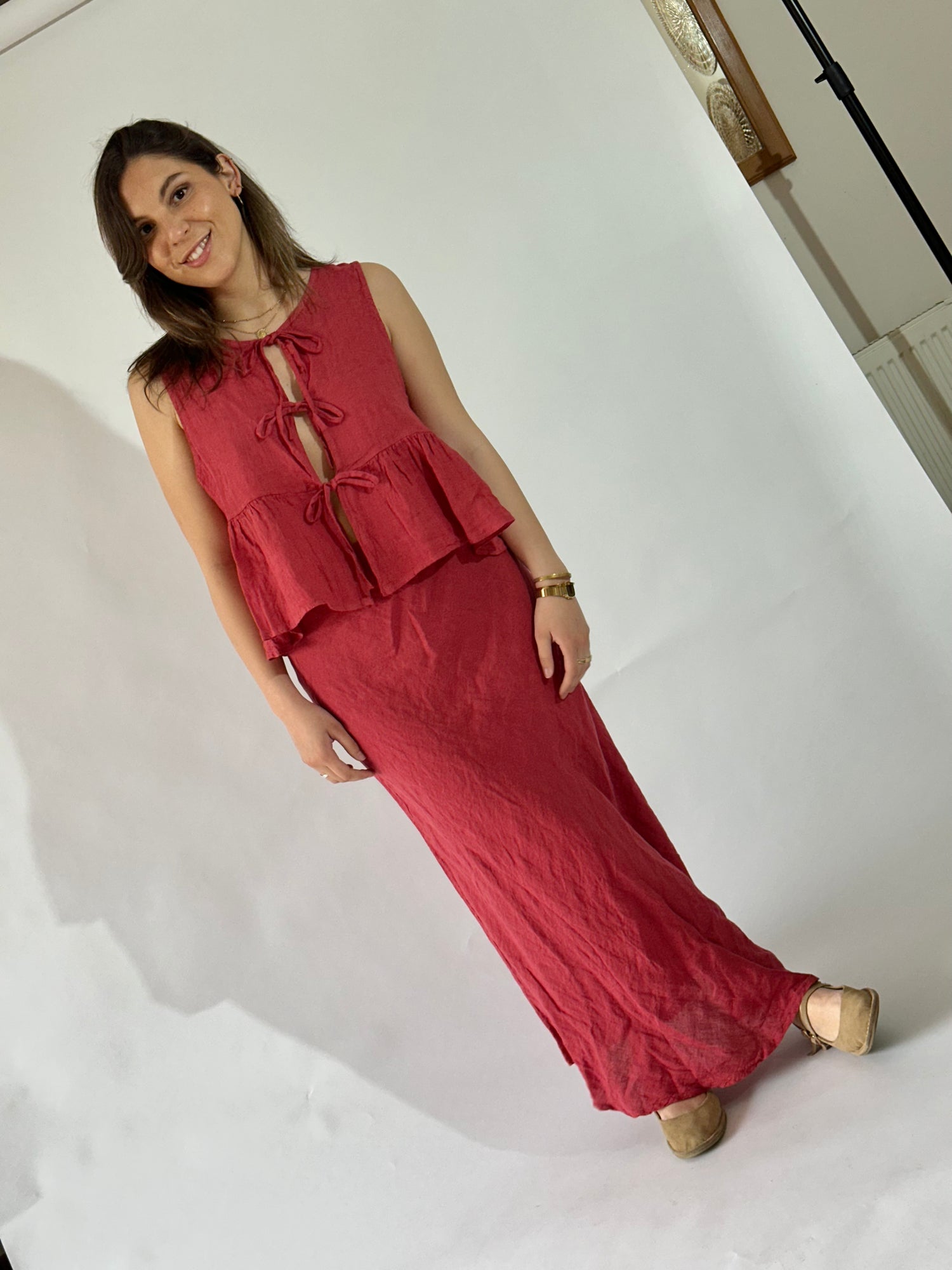 Blusa sin mangas con 3 amarras frontales y vuelo, en lino italiano - Composición: 100% lino- Talla: Talla única- Colores: Blanco, Beige, Fango, Marrón, Rosa, Teja, Burdeo, Musgo, Celeste, Azul Marino y Negro.