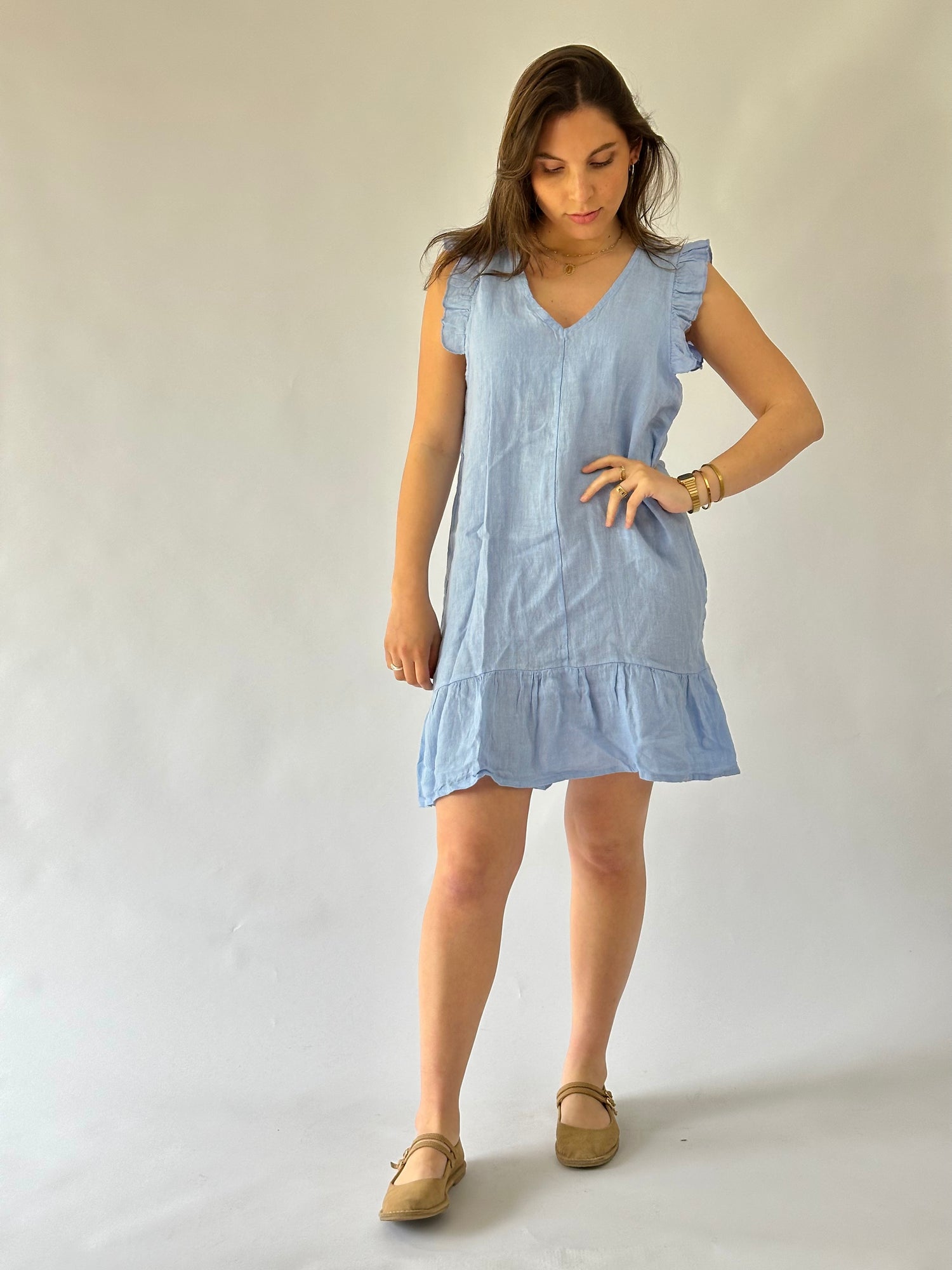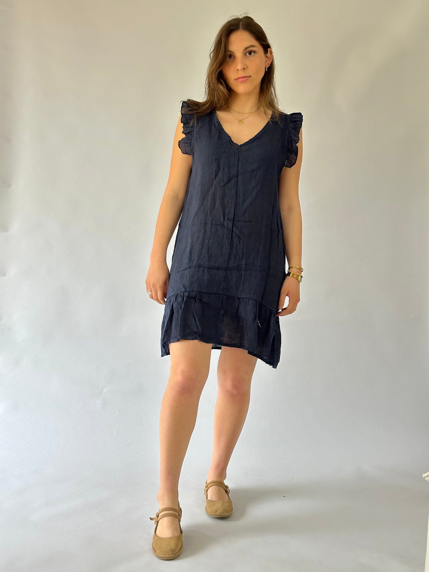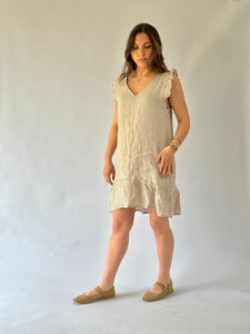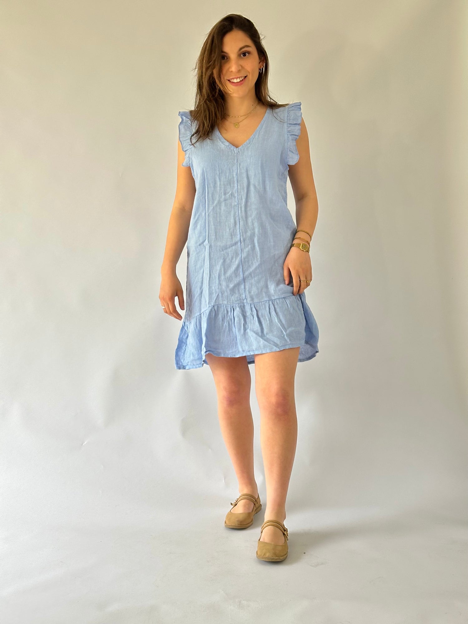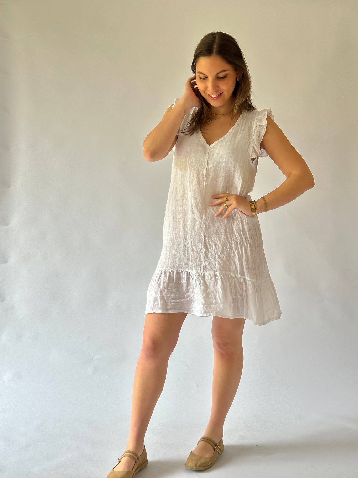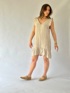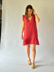 Vestido corto con manga con vuelo, escote en V, en lino italiano - Composición: 100% lino- Talla: Talla única- Colores: Blanco, Beige, Fango, Marrón, Rosa, Teja, Burdeo, Musgo, Celeste, Azul Marino y Negro.