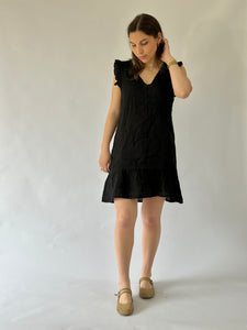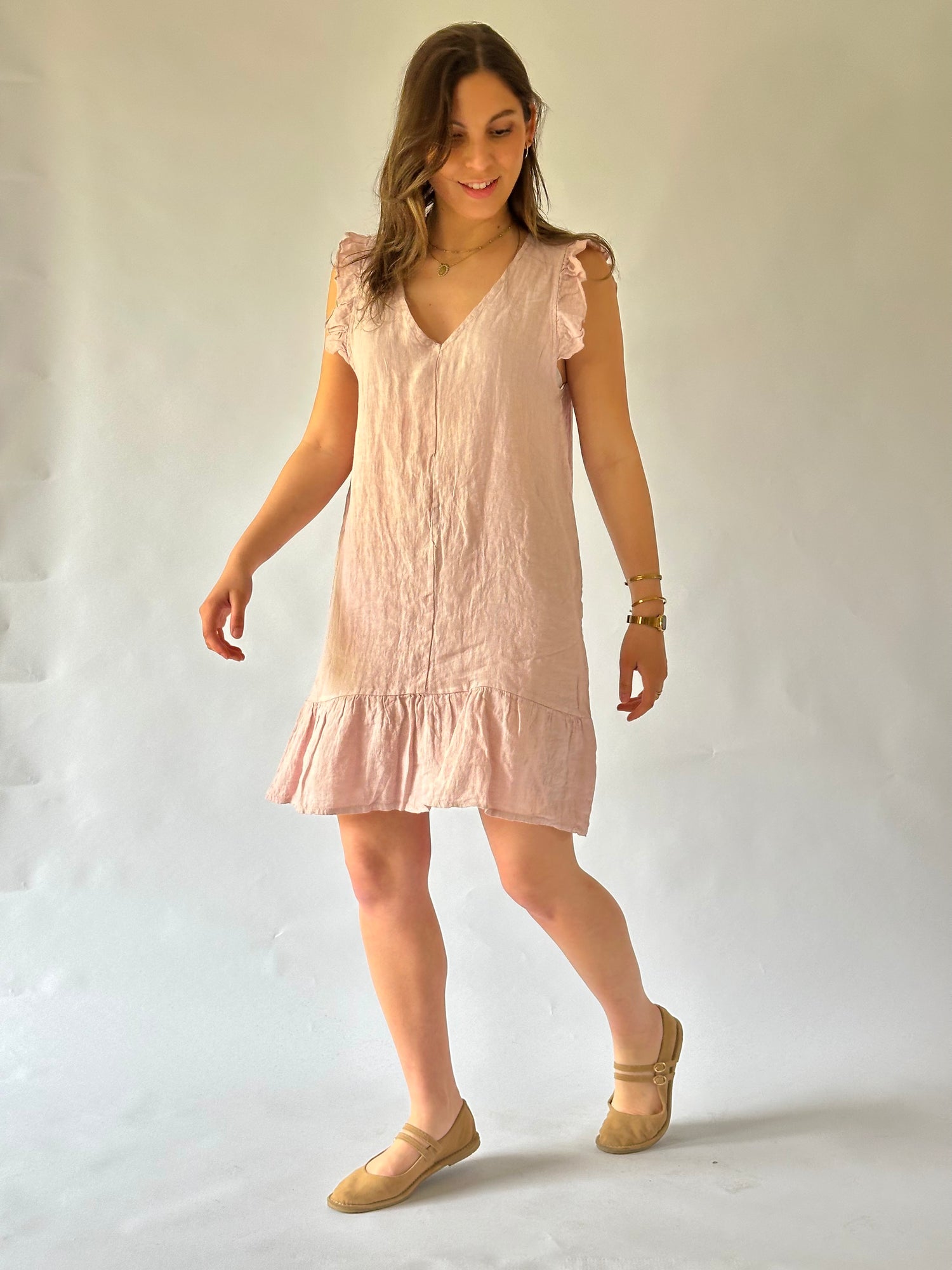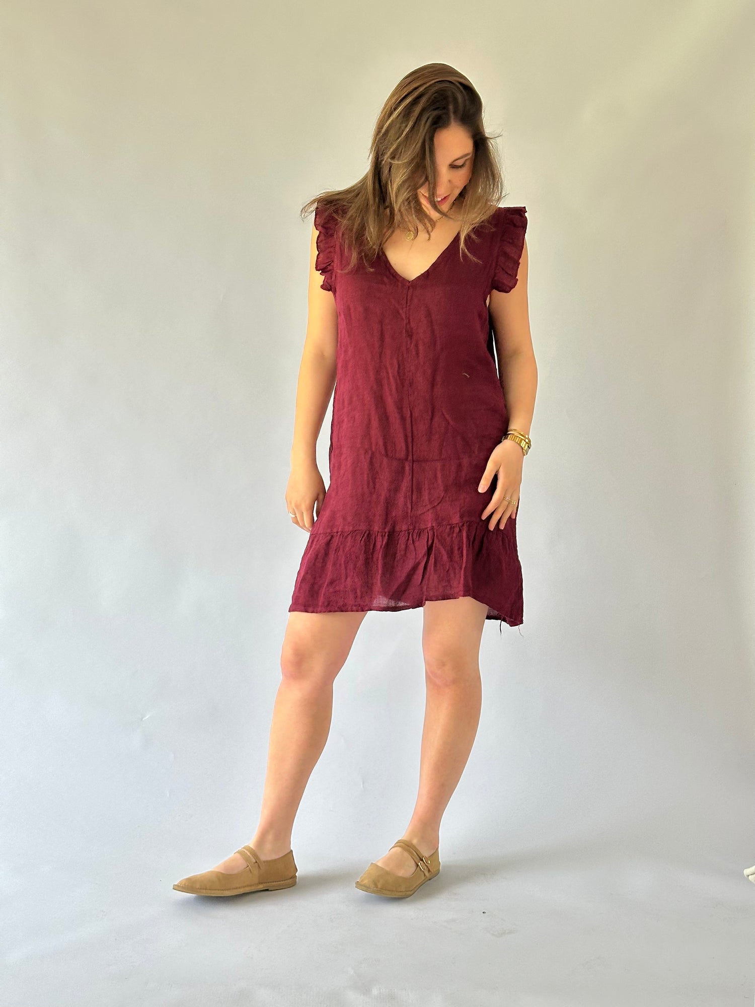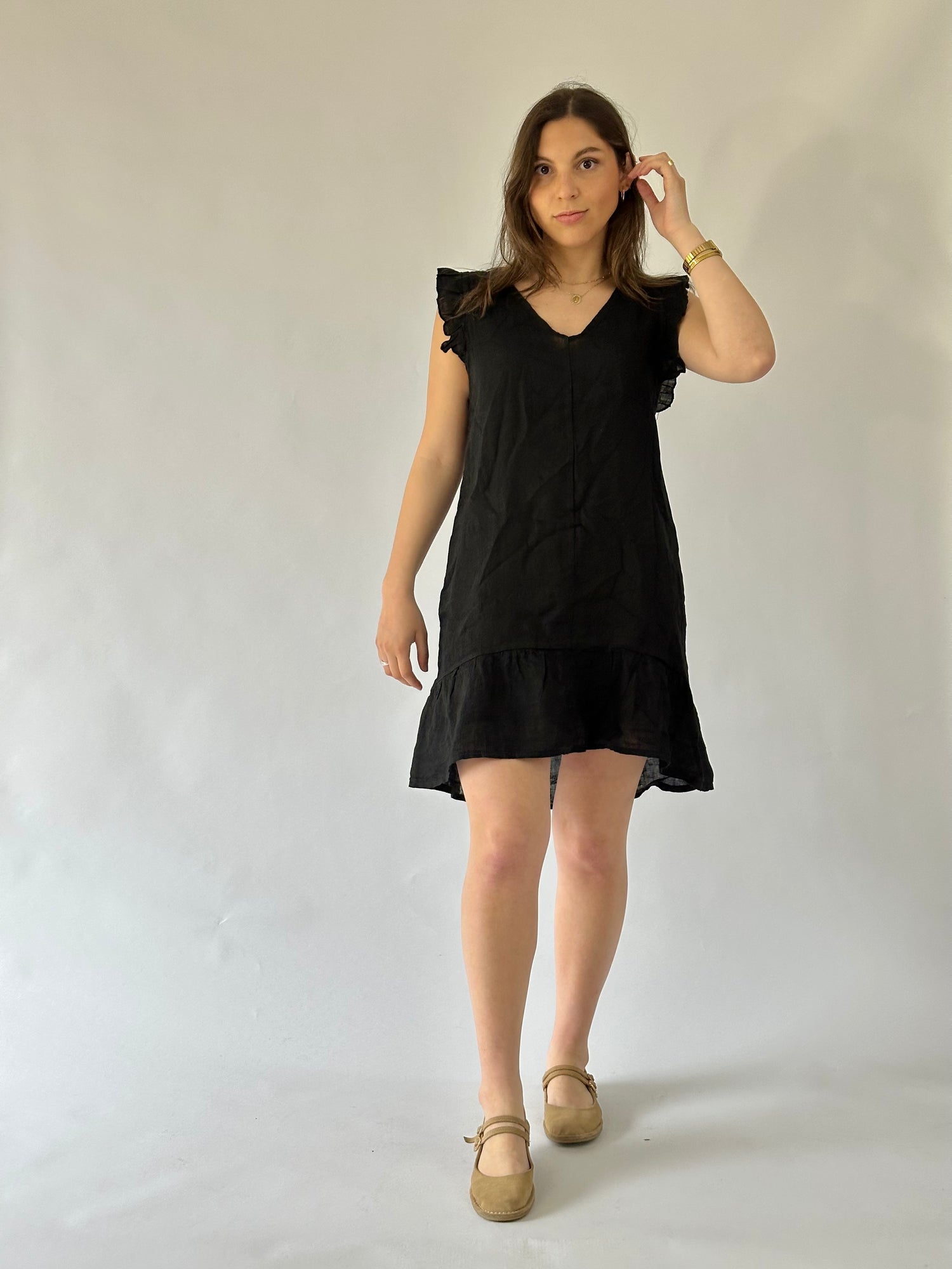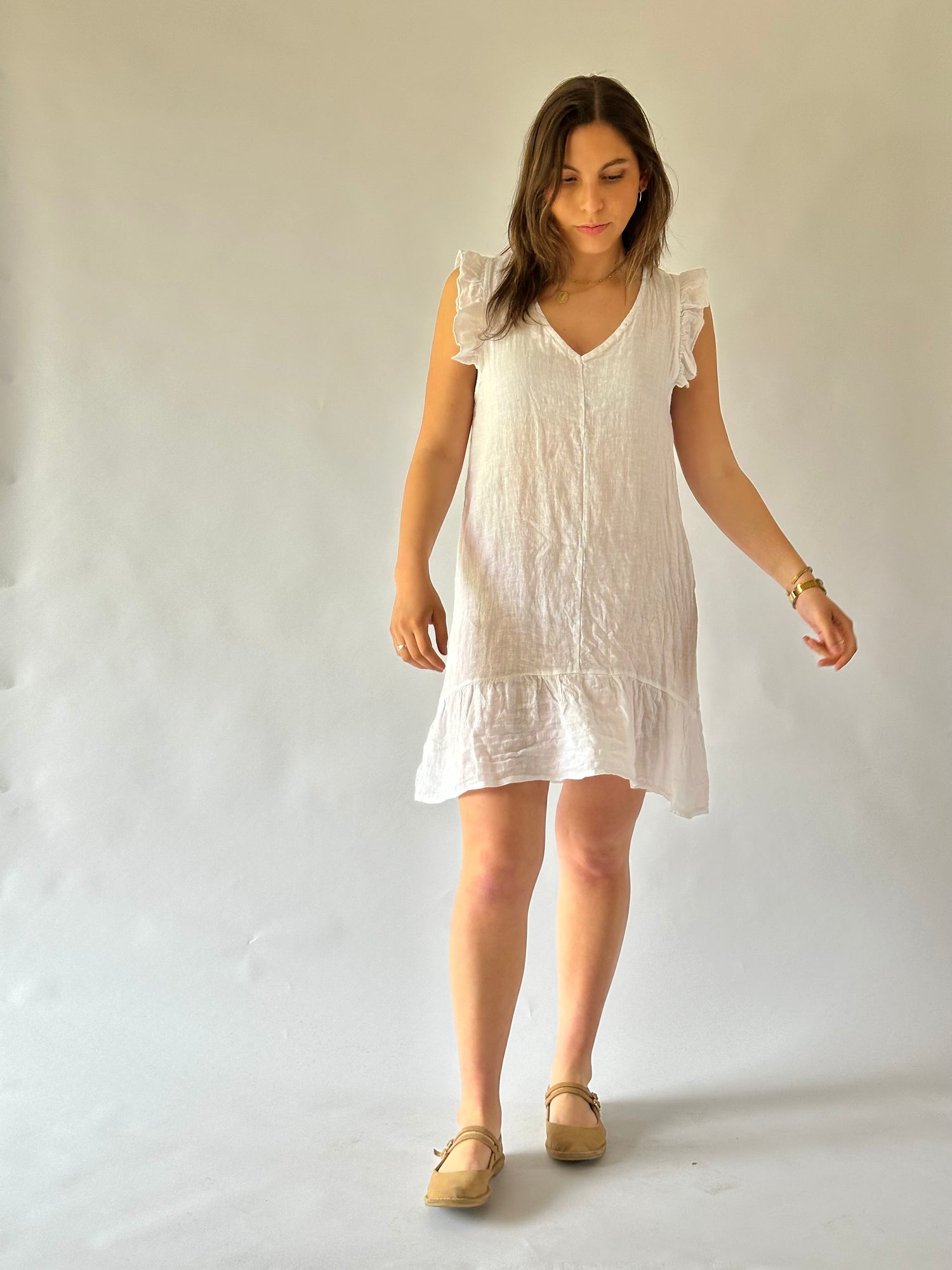 Vestido corto con manga con vuelo, escote en V, en lino italiano - Composición: 100% lino- Talla: Talla única- Colores: Blanco, Beige, Fango, Marrón, Rosa, Teja, Burdeo, Musgo, Celeste, Azul Marino y Negro.
